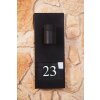 Der schwarzen Ausführung der beliebten Eingangsleuchte aus Aluminium sind silberne Ziffern beigelegt: Auch dreistellige Hausnummern finden in dem von einer Glasfront geschützten Feld ausreichend Platz.
